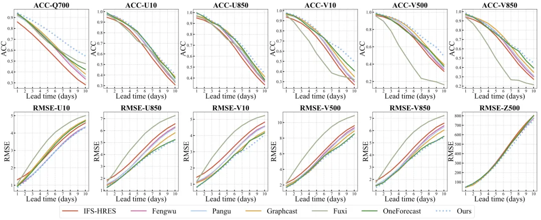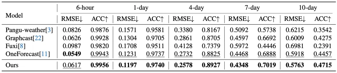 在6小时到10天的所有预报时效上,STCast的RMSE和ACC均优于Pangu-Weather、Graphcast、Fuxi和OneForecast等主流模型,尤其在7天以上的长期预报中优势明显: