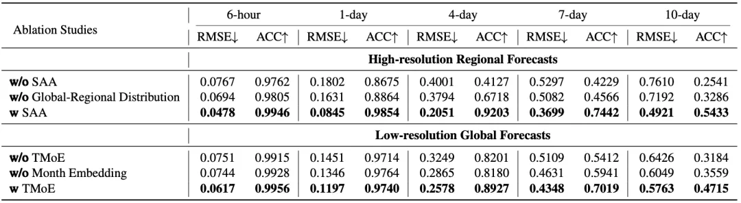 为了验证SAA和TMoE的有效性,我们进行了全面的消融实验: